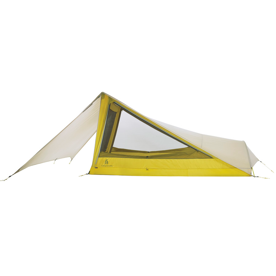 Usually, one wall spells condensation problems, even in light rain. Flylight’s awning and side wings solve that problem, allowing vents to remain deployed in everything but sideways rain. Trekking poles prop and tension the vertical headwall for spacious headroom and minimal contact between you and your tent.