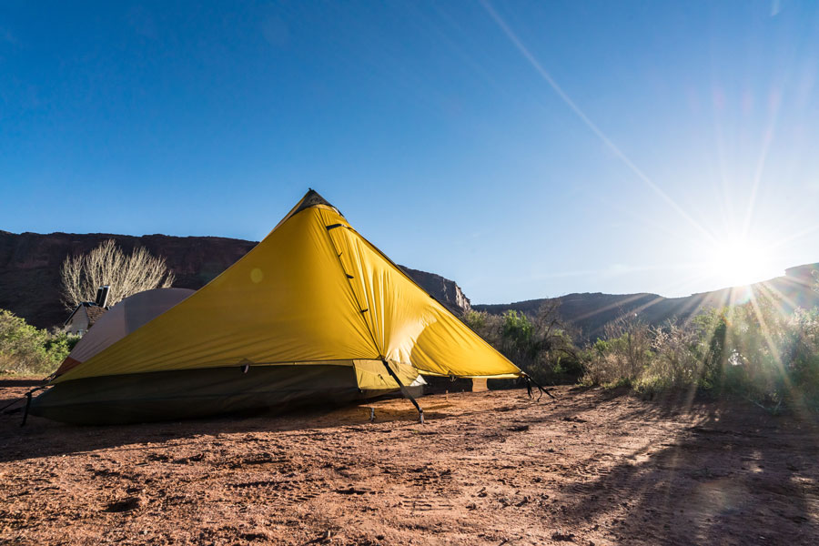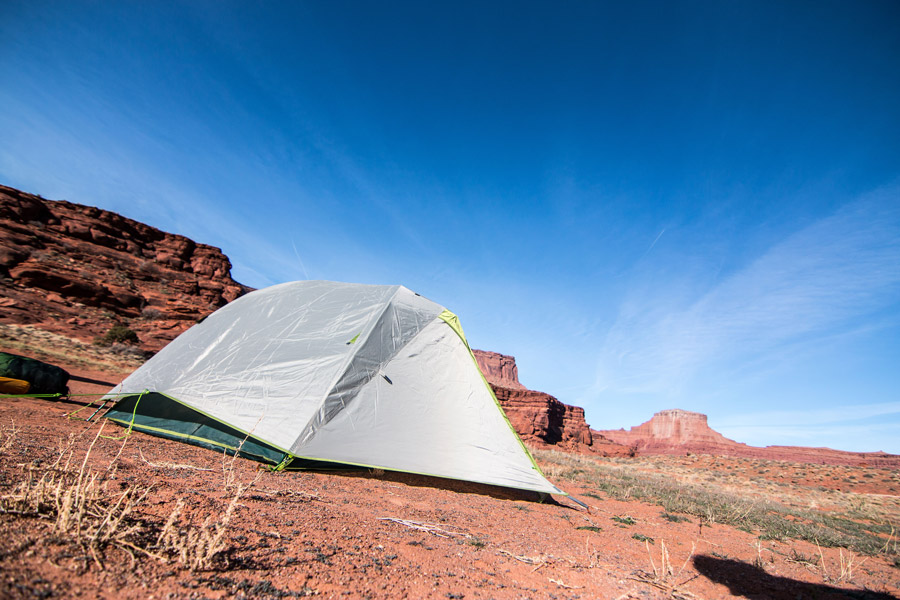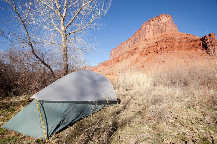 Field Notes: Ghost UL2 landed at the bottom of cold desert canyons deep in the backcountry and was pitched along warm river banks. A night of high winds (40-50 mph gusts) had testers nervous about the lightweight skeleton and paper-thin fly getting torn to bits. No need to fear as the Mountain Hardwear Ghost was as inconspicuous as its namesake in the thunderous storm.